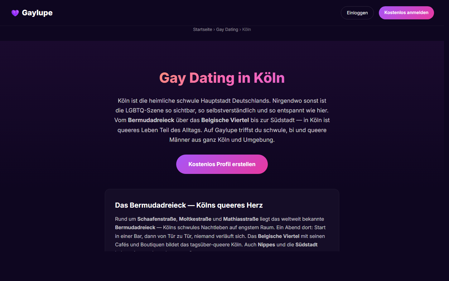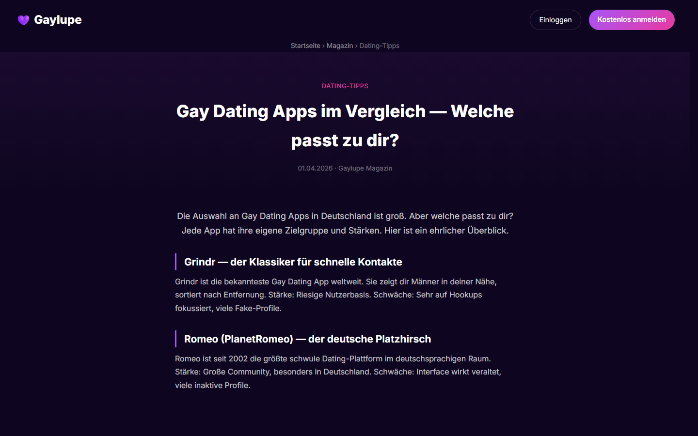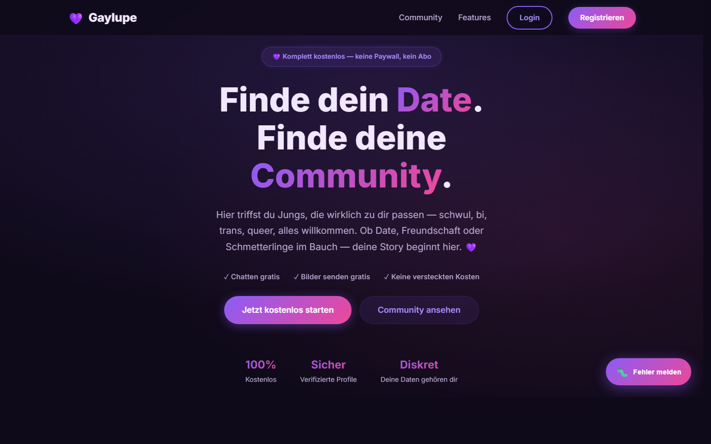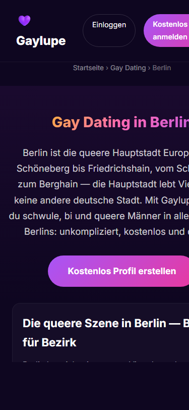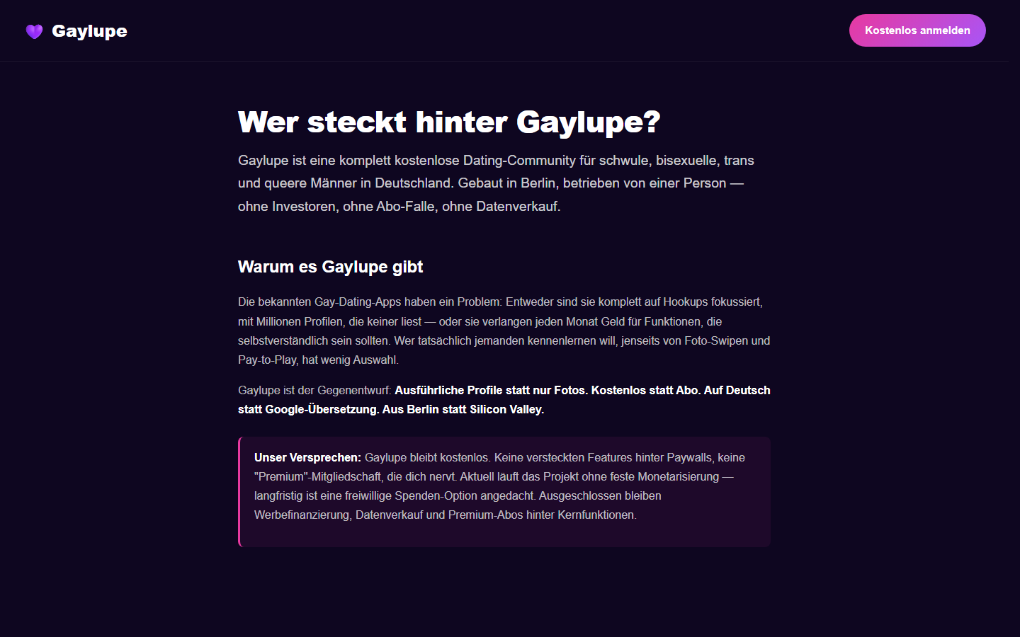 Gaylupe™ ist eine deutschsprachige Dating-Community für schwule, bisexuelle, trans und queere Männer. Aus Berlin entwickelt, komplett kostenlos, werbefrei, ohne Datenverkauf — betrieben von einer Einzelperson als Gegenentwurf zu Grindr und Romeo. Der Markenname „Gaylupe" ist beim Deutschen Patent- und Markenamt (DPMA) angemeldet.