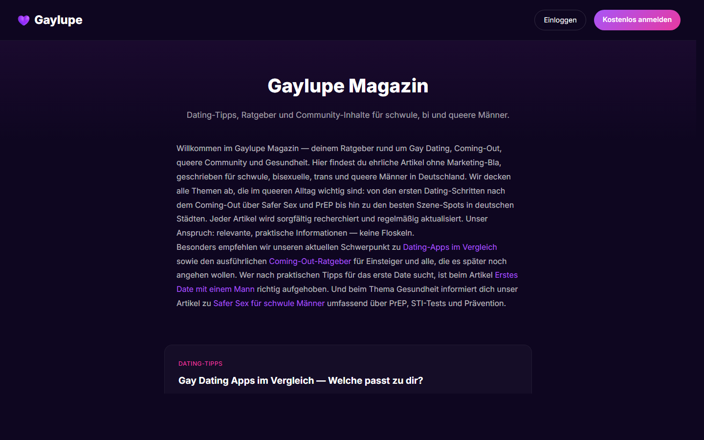 - Inklusiv: Ausdrücklich schwul, bi, trans und queer — keine Gatekeeper